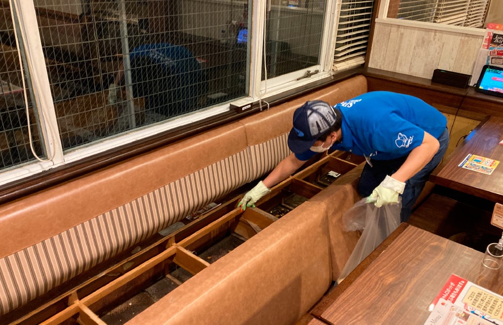 すかいらーくグループ店舗の定期清掃を全国で推進。客席、厨房の清掃をはじめ、店内の空調機やダクトなど、店舗のあらゆる箇所の美観清掃を請け負っています。また、閉店後にしかできない「店舗設備の安全点検」や「害虫駆除」なども実施。全国を78のエリアに分割して、機動的に対応しています。